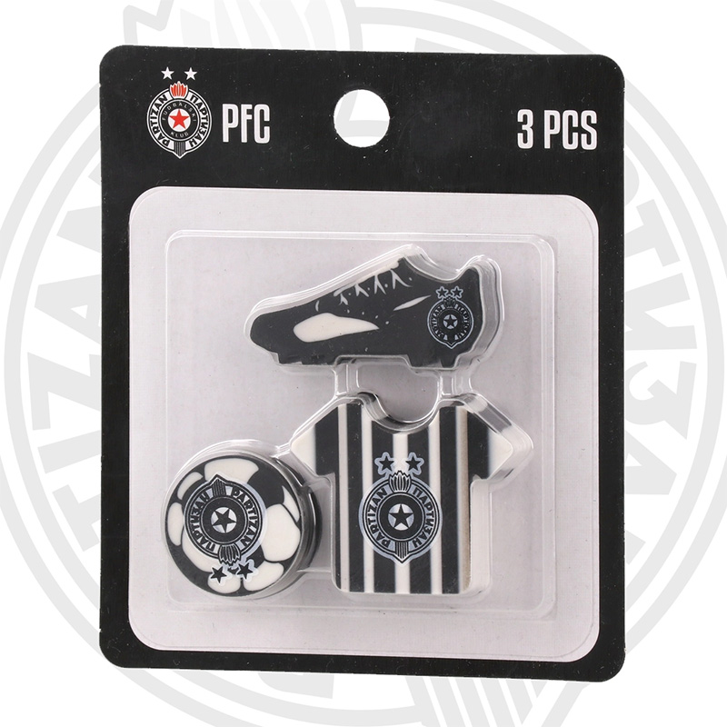 Pakovanje sa 3 gumice za brisanje - u obliku dresa, kopačke i lopte, sa motivom Partizana.