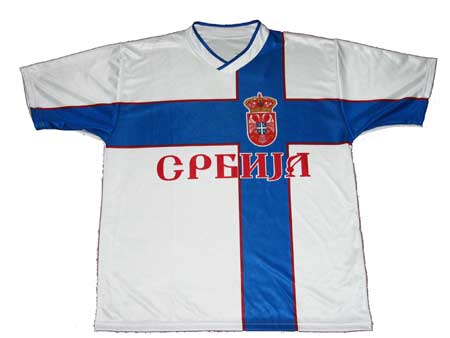Serbian supporter's jersey, white-blue, with Serbian coat of arms and red inscription SERBIA