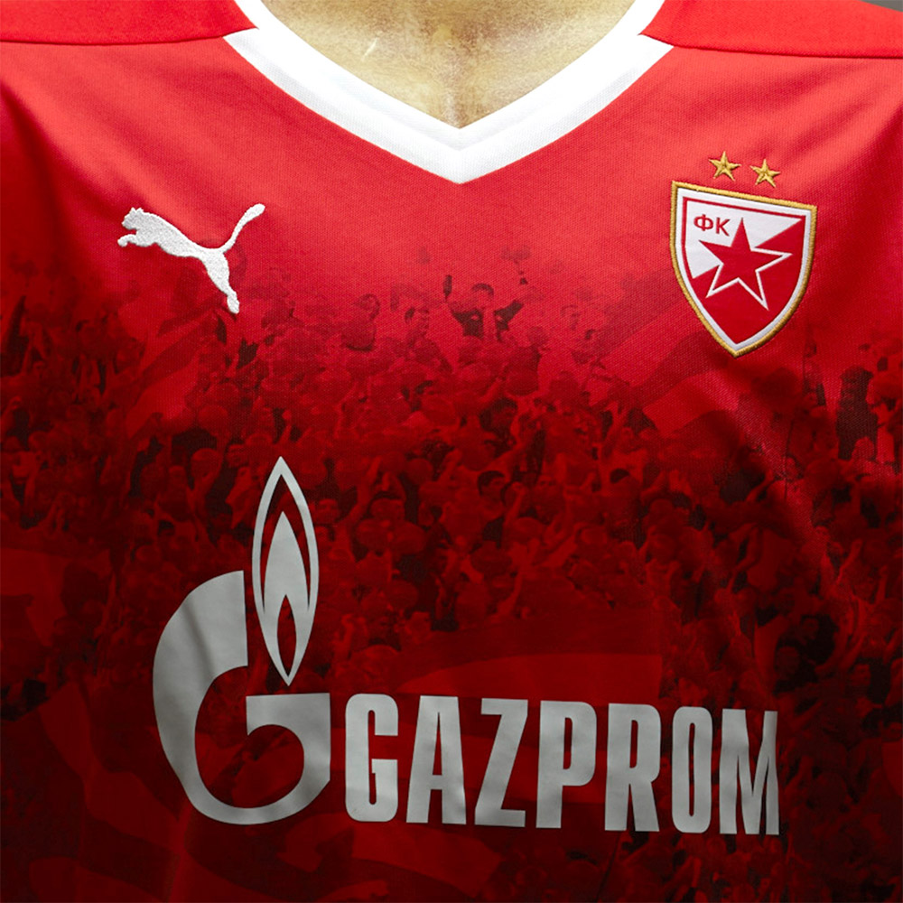 New red Puma Red Star jersey for season 2014/15. Jersey has picture of fans at stadium on the front side, a printed logo of Gazprom, embroidered emblem of Puma company and club emblem is a combination of embroidery-jacquard.