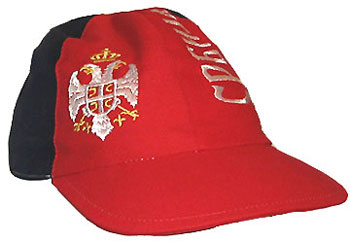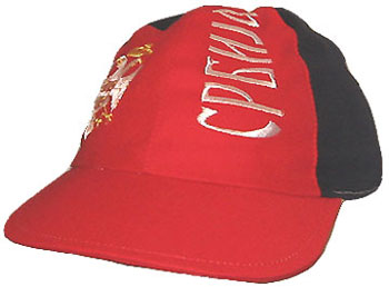 Red - navy blue cap with inscription Serbia and embroided emblem of Serbia.