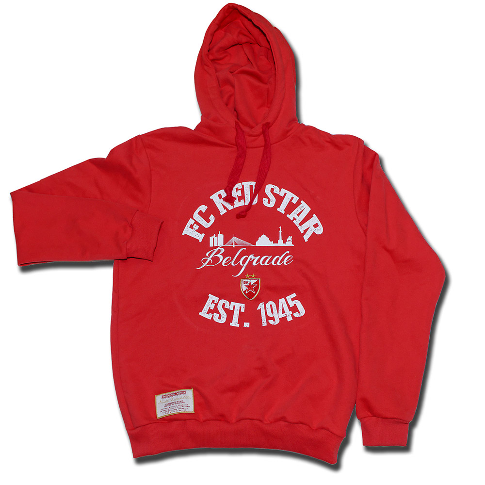 Hooded sweatshirt with printed inscription on chest FC Red Star Belgrade est. 1945 and embroidered outlines the sights of Belgrade and club emblem. It has two side pockets.
