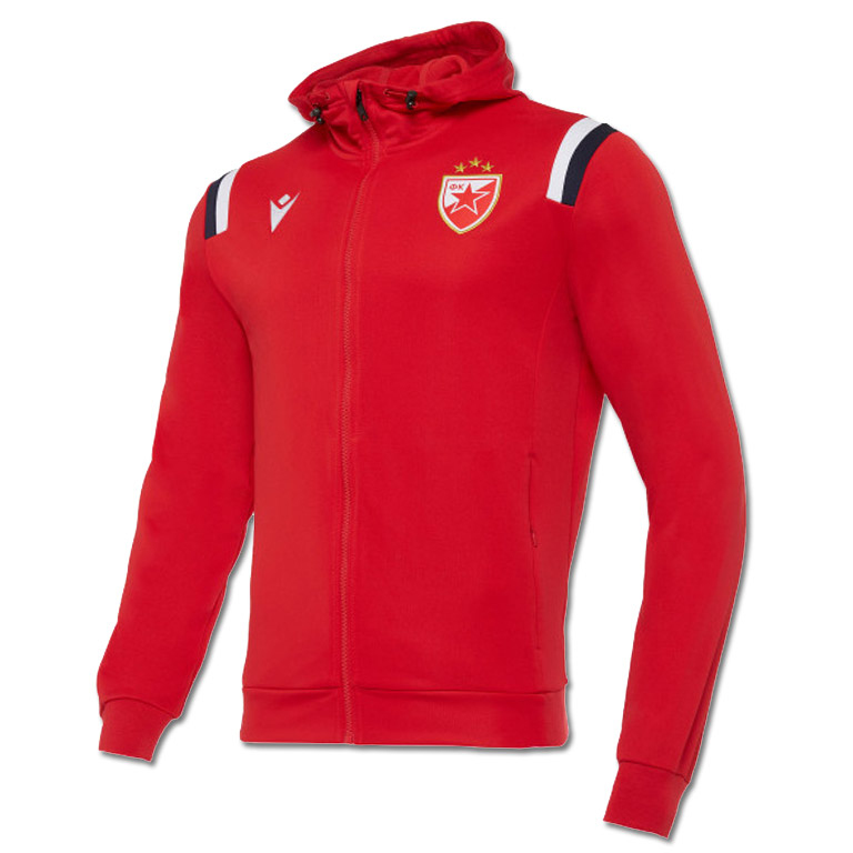 Macron crveni duks sa kapuljačom za igrače Crvene Zvezde. Džepovi sa strane, visoka kragna. Detalji bele i teget boje na ramenima. Na leđima veliki Gazprom logo.