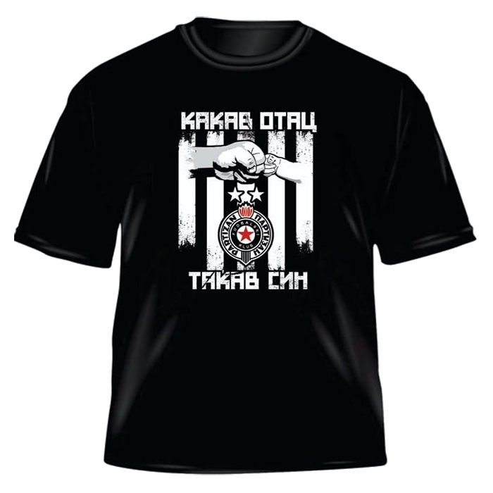 Black men's T-shirt with inscription "Like father like son" and an illustration of large and small fists greeting, with FC Partizan emblem.