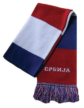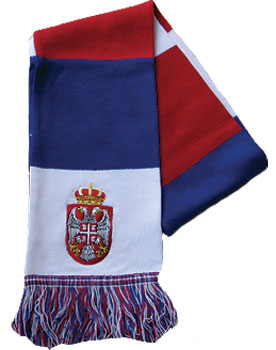 Wollen scarf Serbia in Serbia flag colours with knitted emblem and inscription Serbian on the back.