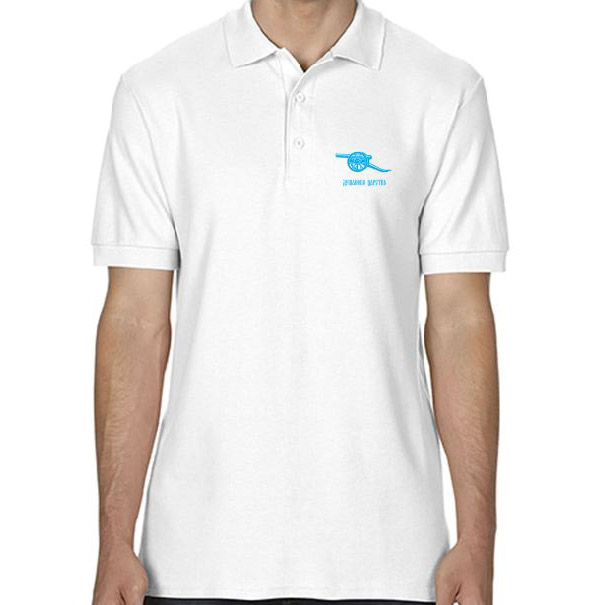 Bela polo majica sa štampom na grudima - natpis Dušanovo carstvo i silueta topa.