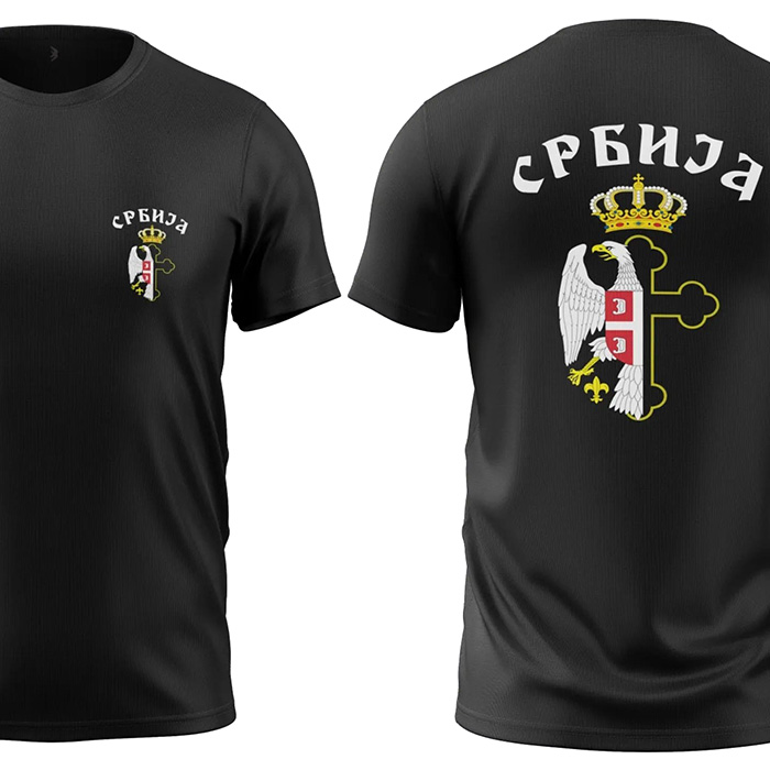 Black men's t-shirt with a white inscription Serbia and a sign that is half eagle and half cross.