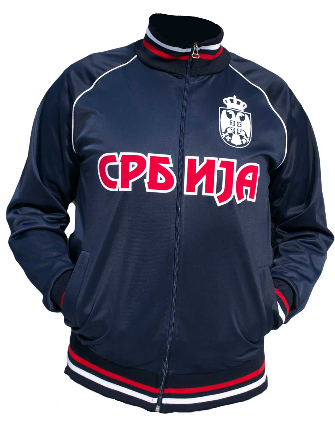 SERBIA navy blue track suit top with large cyrillic inscription SERBIA on the chest, and Serbian emblems (two headed eagle) on the chest and.