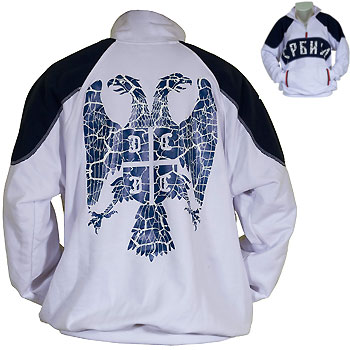 Most elegant and sporty Serbian sweat shirt, in navy-blue and combination, with large cyrillic inscription in front, and Serbian emblem (two-headed white eagle) printed in the back.